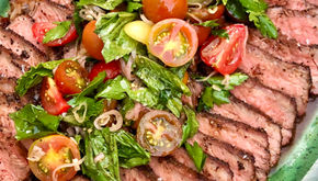 Coffee Rubbed Steaks with Herby Tomato Salad